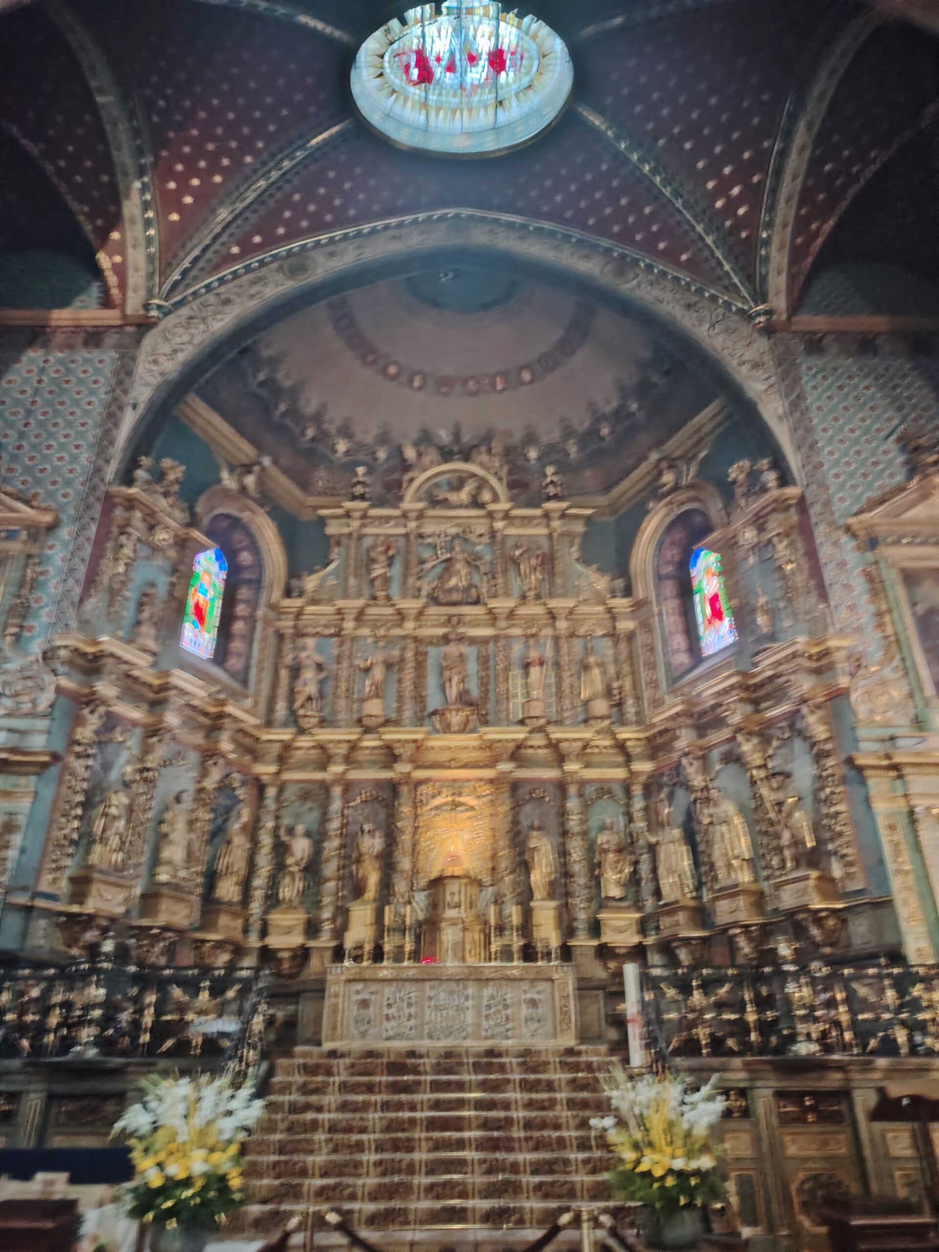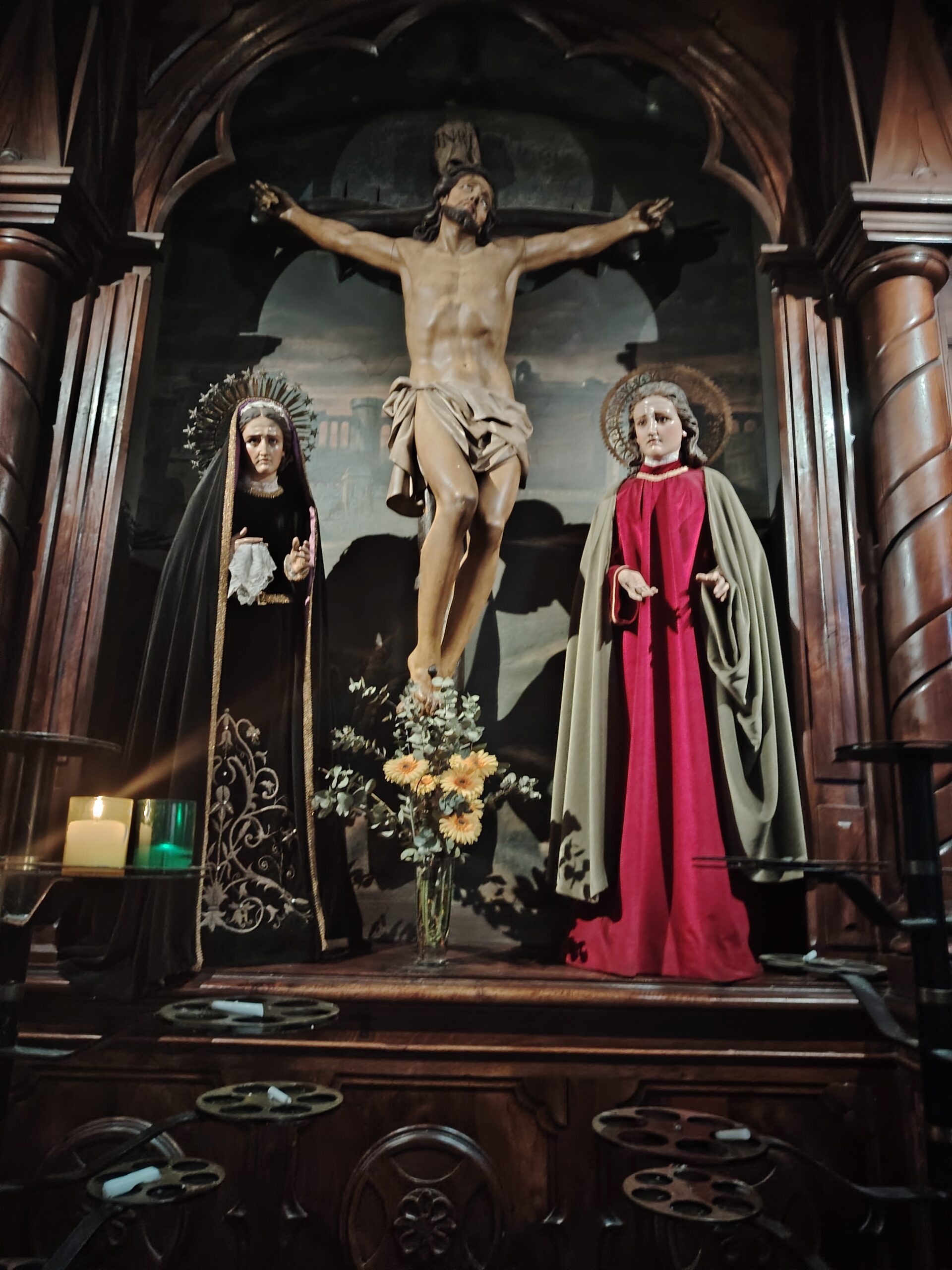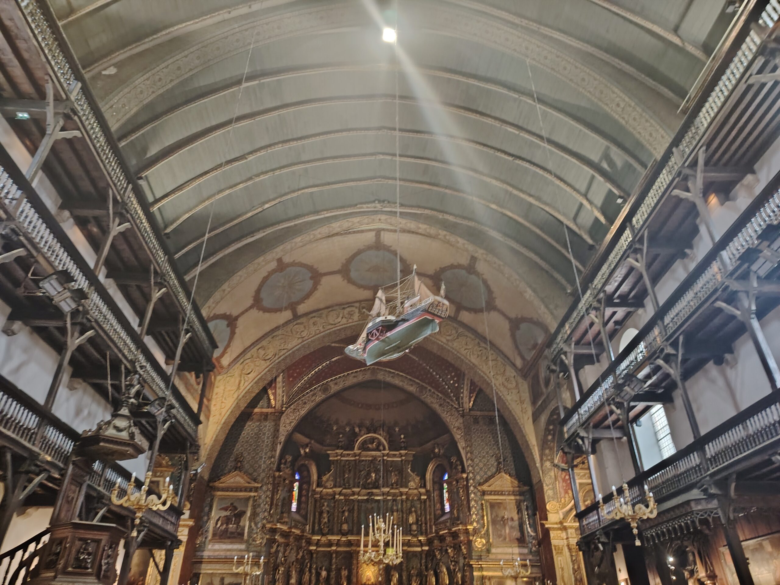 The church is known for its monumental altarpiece, in carved gilded wood.